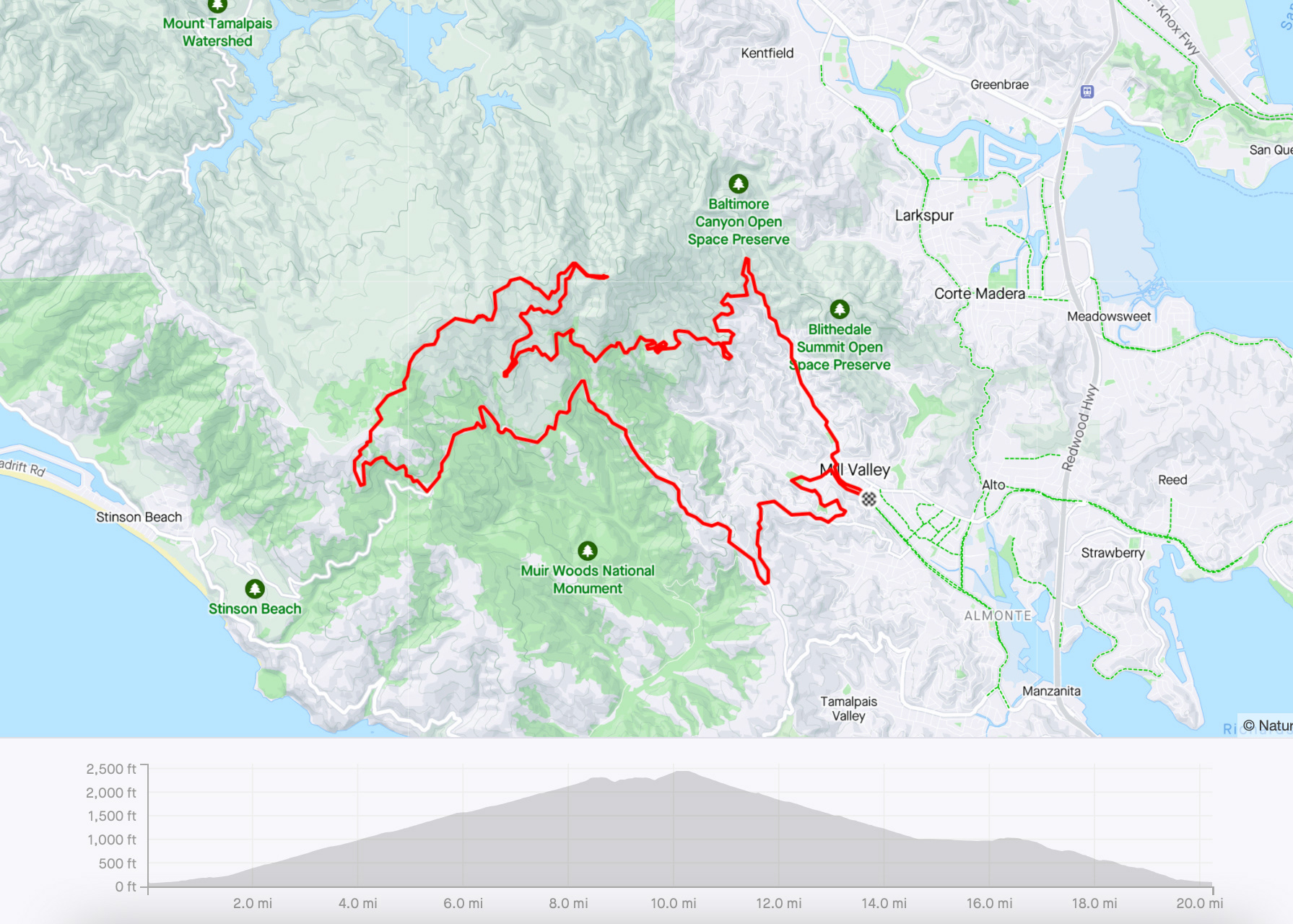 When you leave the parking lot, you will stay on the paved road and encounter one last climb before the long descent back along E Ridgecrest Blvd and Pan Toll Road. Around mile 13, you will take a left on Panoramic Highway and continue your descent for 4.5 miles. Stay alert for the busy Sequoia Valley Road intersection around mile 17.5 and take a left. Enjoy the twists and turns through the residential redwood-lined roads back to Mill Valley.