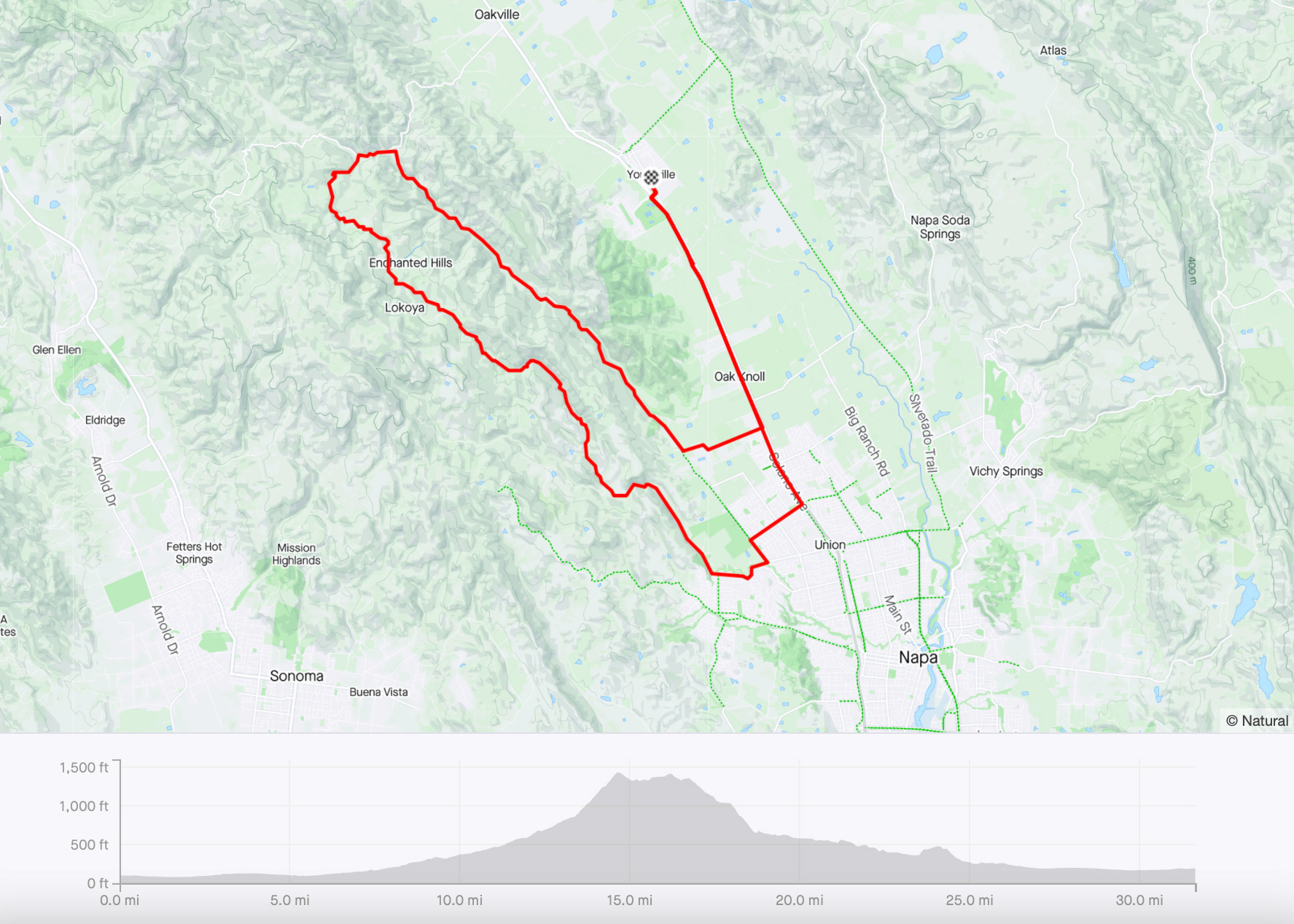 Starting from Yountville (there is a free public parking lot off of Mulberry St behind the Post Office/Library/Police Station), head south through town and cross under the freeway to pick up the Napa Valley Vine Trail. Enjoy an easy, flat warm-up for the first 5.5 miles on the path, until you reach Trower Ave. Continue west on Trower Ave and south on Dry Creek Rd until you reach Redwood Rd at mile 7.